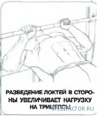Поэтому: если парень сильно "разводит" локти в стороны при выполнении жима лёжа, его трицепсы и передние дельты будут выполнять всего лишь роль стабилизаторов, а потому напряжены по минимуму!