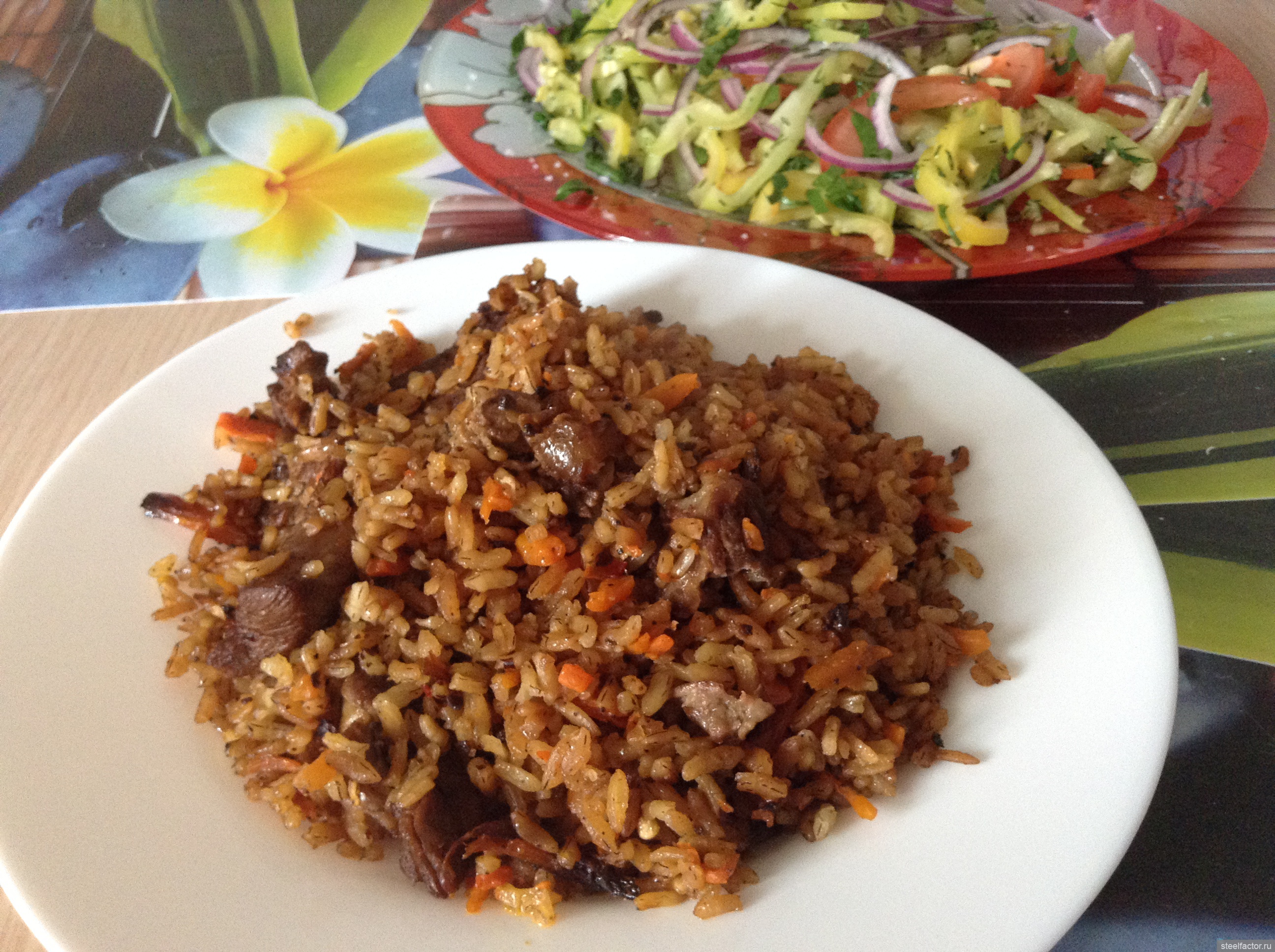 1. для любителей мужского коричневого плова- лук идет в начале и ужаривается до состояния карамель-горелки, далее идет мясо. Жженый лук дает коричневый оттенок. кто любит более светлый плов - лук идет после мяса.