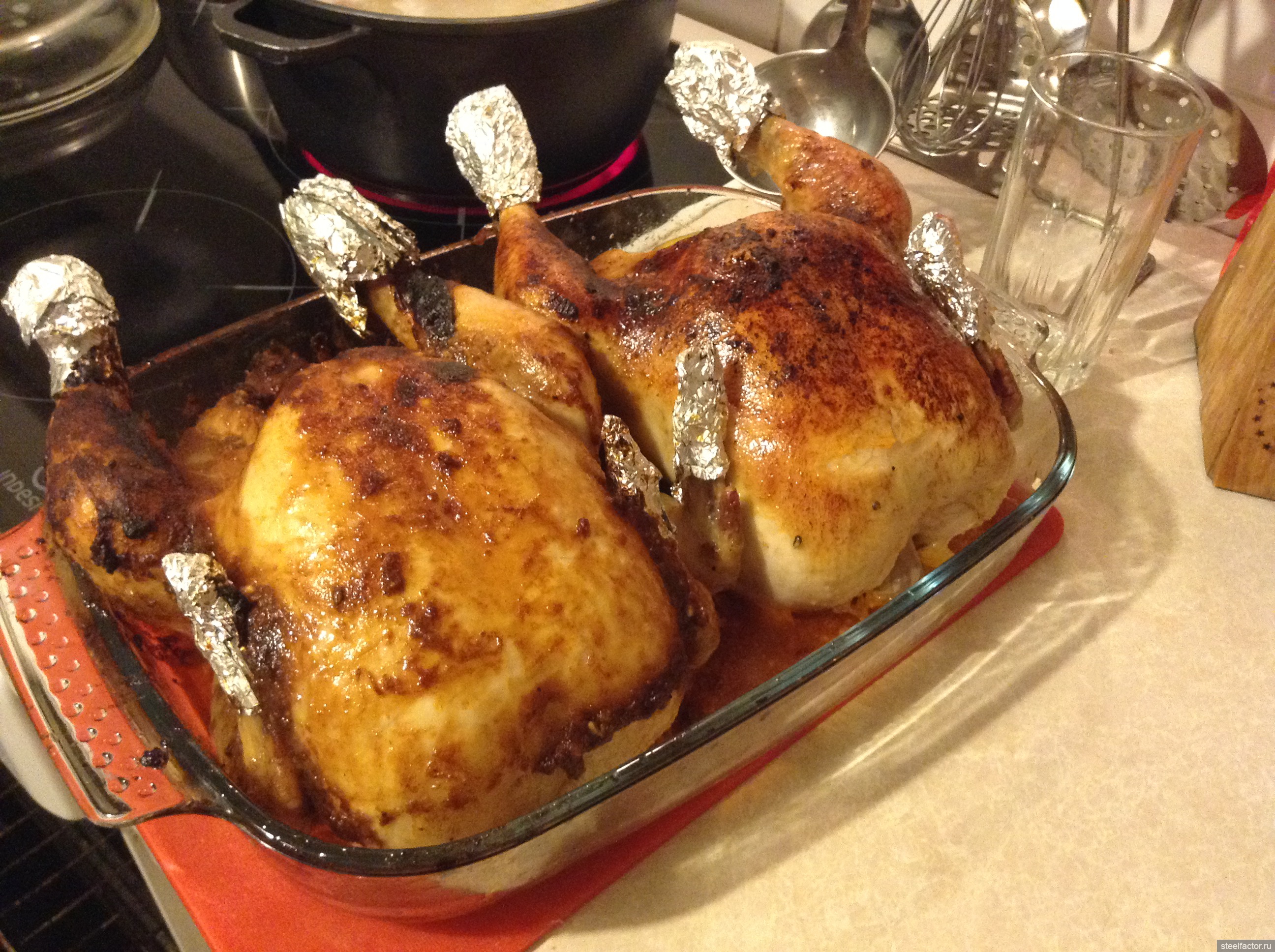 Берем «Ясные зори», рукав для выпекания или можно не брать. А чем разница? разница в том, что в барочном рукаве скапливается бульошка, которую можно использовать для следующих блюд (но не в этом случае!), +выше температура и быстрее готовность курятинки.