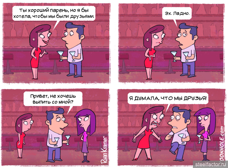 Парочка характерных женских фраз: "Ему не повезло с женщиной, но не надо разочаровываться во всех женщинах", "Вы не тех женщин выбираете" — подразумевается, что где-то есть "те". Женщины, которые сами про себя прекрасно знают правду, скорее палец позволят отрезать, чем эту правду озвучат. Иначе мужчина просто будет демотивирован в поиске "нового счастья", а это противоречит корпоративным женским интересам, это не выгодно всем женщинам скопом.