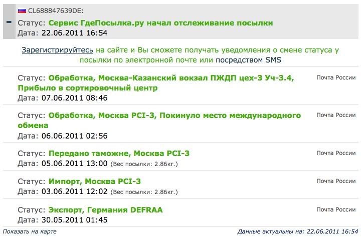 Я позвонил по московскому номеру, спросил где моя посылка? Мне вежливая девушка ответила, что она уже передана русской почте, и дала внутренний российский трек. Я попытался пробить этот номер на http://info.russianp...rvlet/post_item. Не получилось. Тогда я пробил номер на http://gdeposylka.ru Справа от поля для номера нужно нажать на стрелочку и выбрать пункт "Внутренний номер отслеживания России".