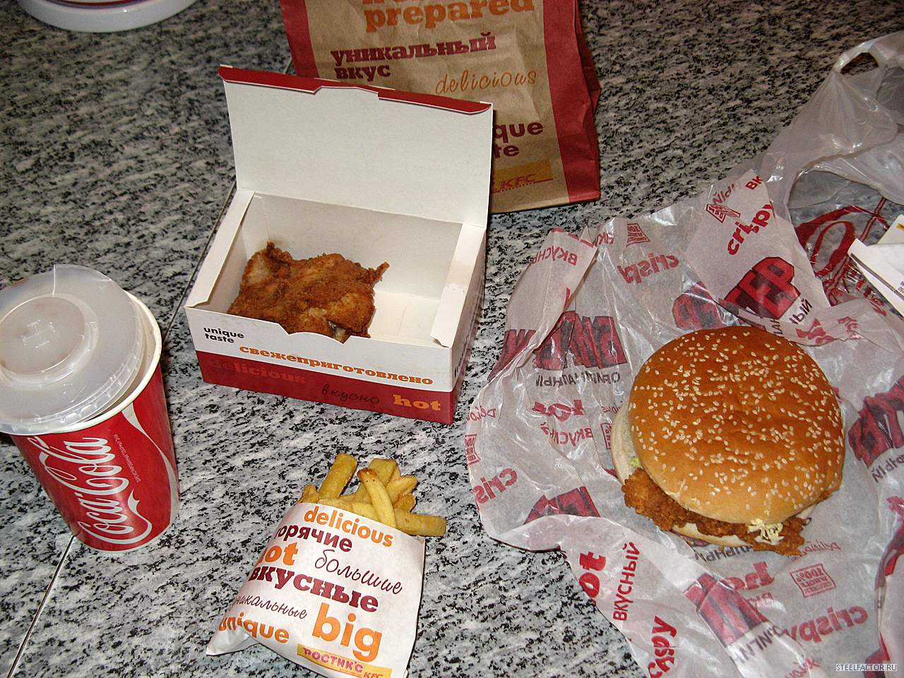 вощем вот таг 4 раза за день - это тока колы полтора литра, кусок курицы в коробке грамм 150 весит минимум, это готовой, сырой там больше 200 получится, да щщё в булке 2 шмата курицы, грамм на 100 минимум, короче одного мяса в день получается больше кило палюбасу