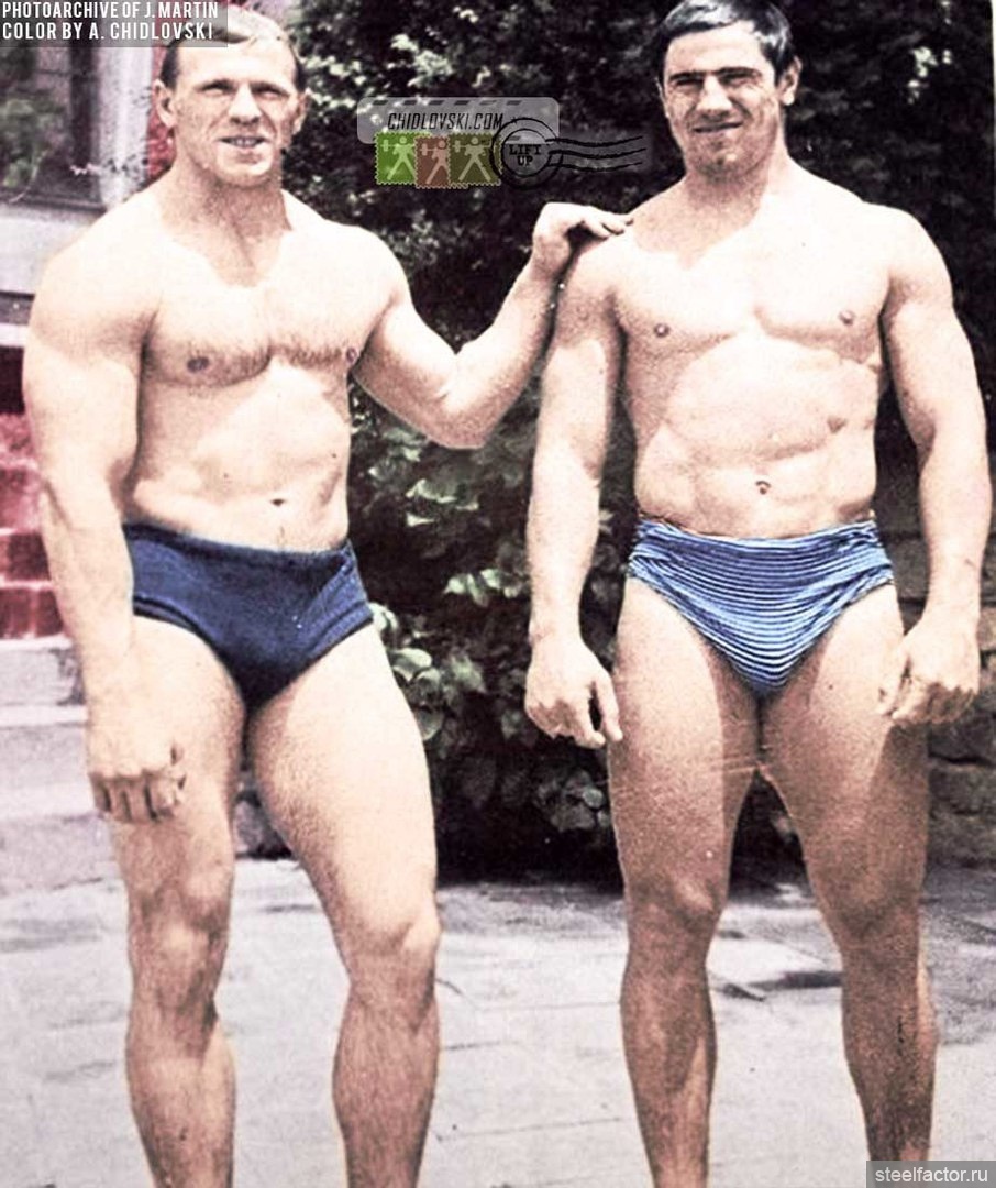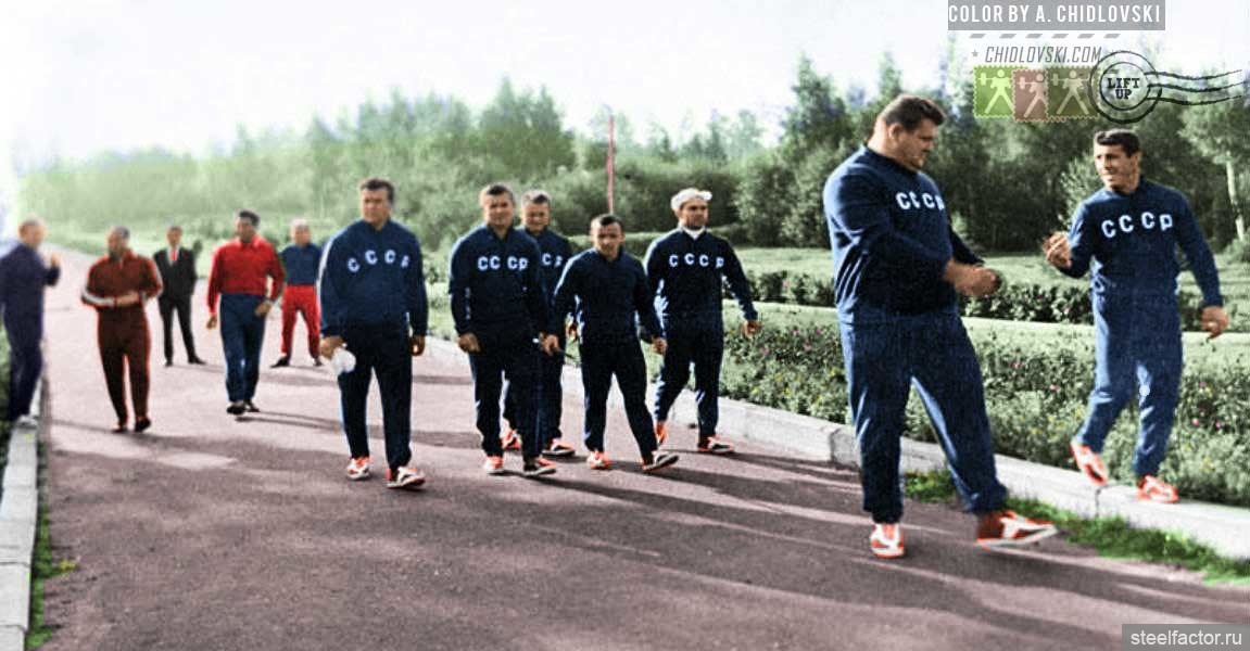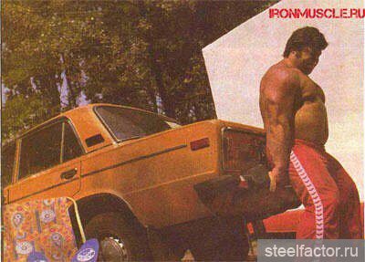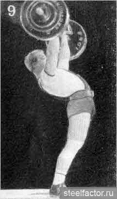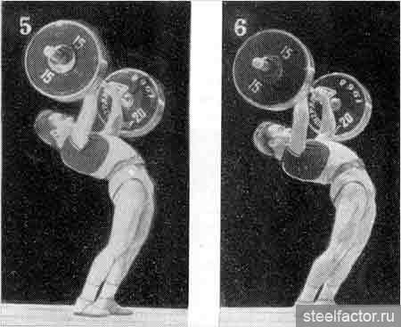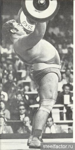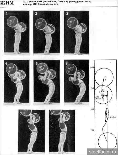 ... Для того чтобы принять правильное положение, нужно было, как говорили тренеры того времени, "обтянуться" — а это означало ссутулить спину, выдвинуть вперёд плечи, руки со сведёнными как можно ближе к друг другу локтями положить трицепсами на рёбра, поджать под себя таз и сильно сжать вместе ягодицы. Ноги при этом должны были оставаться свободными в коленях, ни в коем случае не зажатыми. (Жим стоя был в тяжёлой атлетике единственным движением, где спину нужно было не прогибать, а сутулить. Именно это и позволяло снять нагрузку с поясницы и распределить её равномерно по всему телу.)