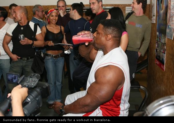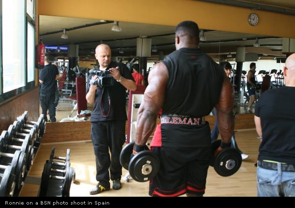 Разогрев мышцы, Ронни начинает увеличивать вес штанги от сета к сету по принципу "пирамиды", пока число повторов не сократится до 2-4.