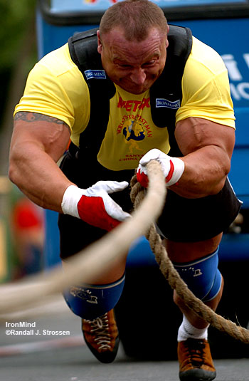 О тенденциях развития современного спорта, практике взаимодействия спортивного, экономического и политического я сужу по своему опыту. Strongman ("спорт силачей"), хотя он и относительно молод, стремительно распространяется по всему миру. Более чем в ста странах ежегодно проходит свыше 500 соревнований, количество посетителей на которых колеблется от нескольких сотен до 25 тысяч человек. Спортивными снарядами здесь служит все, что можно тянуть, удерживать, переносить на расстояние. Атлеты двигают грузовики, поднимают камни весом в 180 кг, переворачивают шины по 500 кг. Спорт силачей, возможно, самая тяжёлая и комплексная проверка человеческой силы, выносливости и одновременно яркое, зрелищное шоу, максимально символизирующее энергию и здоровье. ......