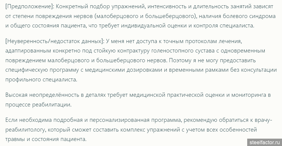 Я о другом. Вот прикола ради поставил ИИ задачу реабилитационный план по моему диагнозу составить. Он на голубом глазу (практически с возгласами: «Бля буду»