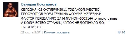 Самое главное в тебе Валерии-ты неисправимый лгун.Соревнования в ростове и ты отбивал мою супругу от стаи озверевших кавазцев.Те вели себя адекватно и просто высказывали восхищение формой моей женщины.Врун...да...не когда и не где и особенно на форуме я не поносил и тем более не оскорблял свою женщину.Если тебе неизвестно слово любовь..то вбей в яндексе что это такое...Если ты хочешь поднять одеяло...и как ты вещал что не принимаешь ас..то напомню тебе разговор на балконе где ты рассказывал что и как ты принимаешь..я таких то и слов не знаю.И что ты прохимичен только слепой не увидет...Но это не грех..грех в том что ты ВРЕШЬ..не какая многоповторка не удержит мышечную массу в любом возрасте...По поводу удара поддых...ты не первый раз подымаешь эту тему на форуме...И мне не привыкать.Уход любимой женщины-это новая любовь и дай бог им счастья и всего самого хорошего.У меня женщины уходят с полным соц пакетом.Твои подруги .....бегут...от понятия что мировозрение твое узко..Изотерика...железо..и и все....Узкая направленость.Самолюбования у тебя не отнять..вот двойной бицепс..и еще раз и еще раз...и еще раз..Молодчина.Кроме железа у тебя нет ничего...Одни воспоминания..А В 1980..А В1970..А в 1990...а я вырастил...а я сделал...везде надо примазатся и высказатся...