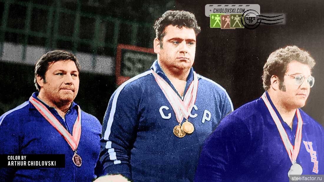 Иван Атанасов (Болгария, бронзовая медаль, 532.5 кг), Василий Алексеев (СССР, золотая медаль, 635 кг) и Кен Патера (США, серебряная медаль, 592.5 кг)