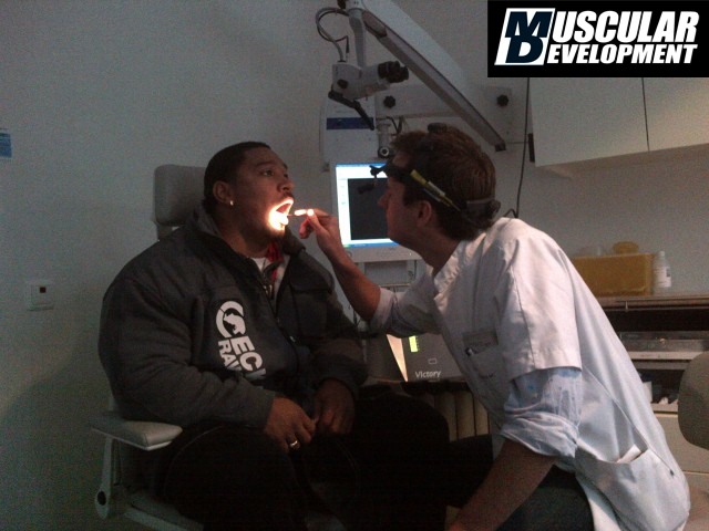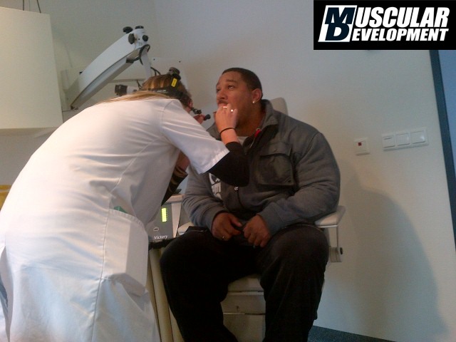 http://www.musculardevelopment.com/team-md-blogs/263-roelly-winklaar-blog/3946-roelly-winklaar-blog-back-on-track-after-the-dentist.htmlA few months back, Roelly Winklaar had some jaw surgery done. He says it was difficult to eat afterwards and it put a damper on his training. Now he's back in the gym and training with "Grandma" Sibil Peeters. Here are some pics of the "Dutch Beast" getting the a-ok from his dentist and a little note from Winklaar himself: