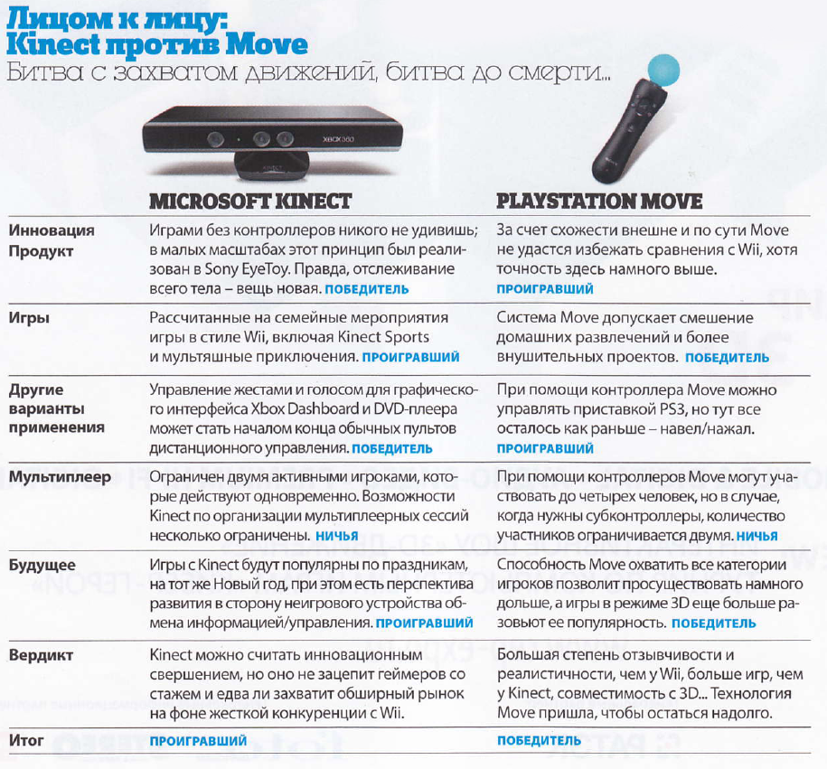 Вообще, на мой взгляд, сравнивать напрямую MOVE и Kinect не вполне корректно, т.к. эти два контроллера предназначены для разных игровых задач. Но народ всё-таки сравнивает, например: http://fotomag.com.u...3ds-109964.html или ещё: