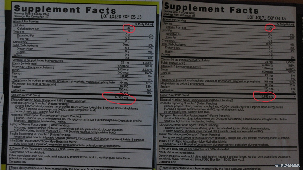 судя по последним строчкам этикеток - вкусы разные? Если так, то отсюда и разница в калориях (от натуральных и не очень вкусовых и арома - добавок) и разница весовой составляющей патентованной смеси на порцию.Разница в этикетках на разных банках SuperPump250