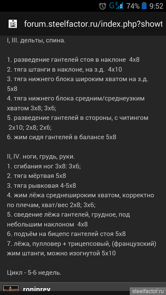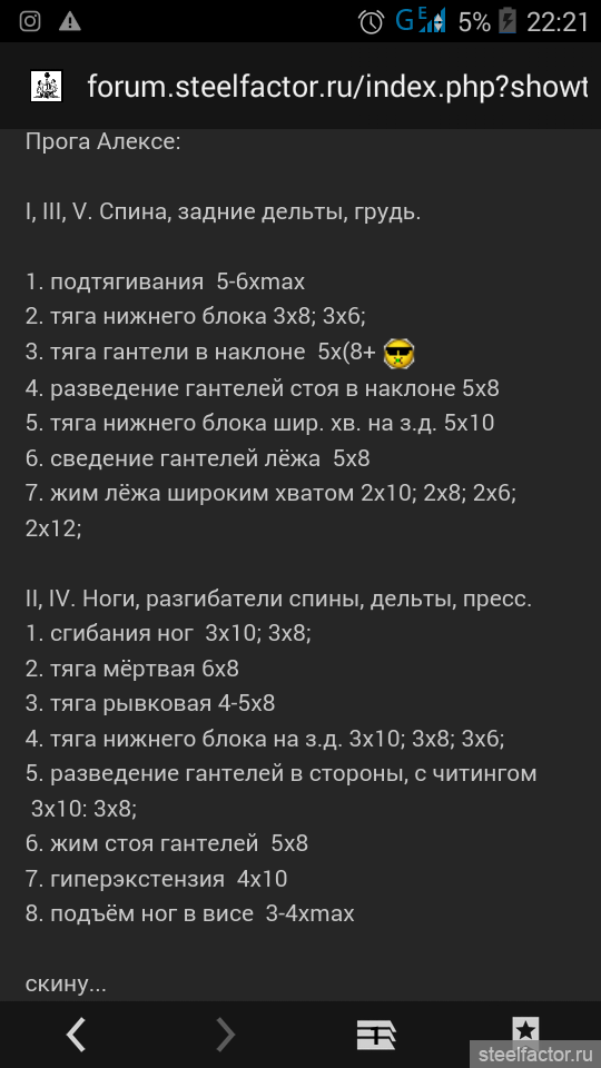 Спасибо за проги, будет как ориентир. Формат просмотра удобный. Сам костяк подходит. Забыл написать, тренировок у нас 5 в неделю, упражнений до 12-ти за треню - не проблема. Если че-нибудь легкое, типа дельты + руки, это где-то на полтора часика. То есть плотность треньки большая. В среднем 5 подходов это 6-10 минут. Не больше. Это нормальный объемный режим. Грудных в проге нет, кормящая мама. Не рискуем.