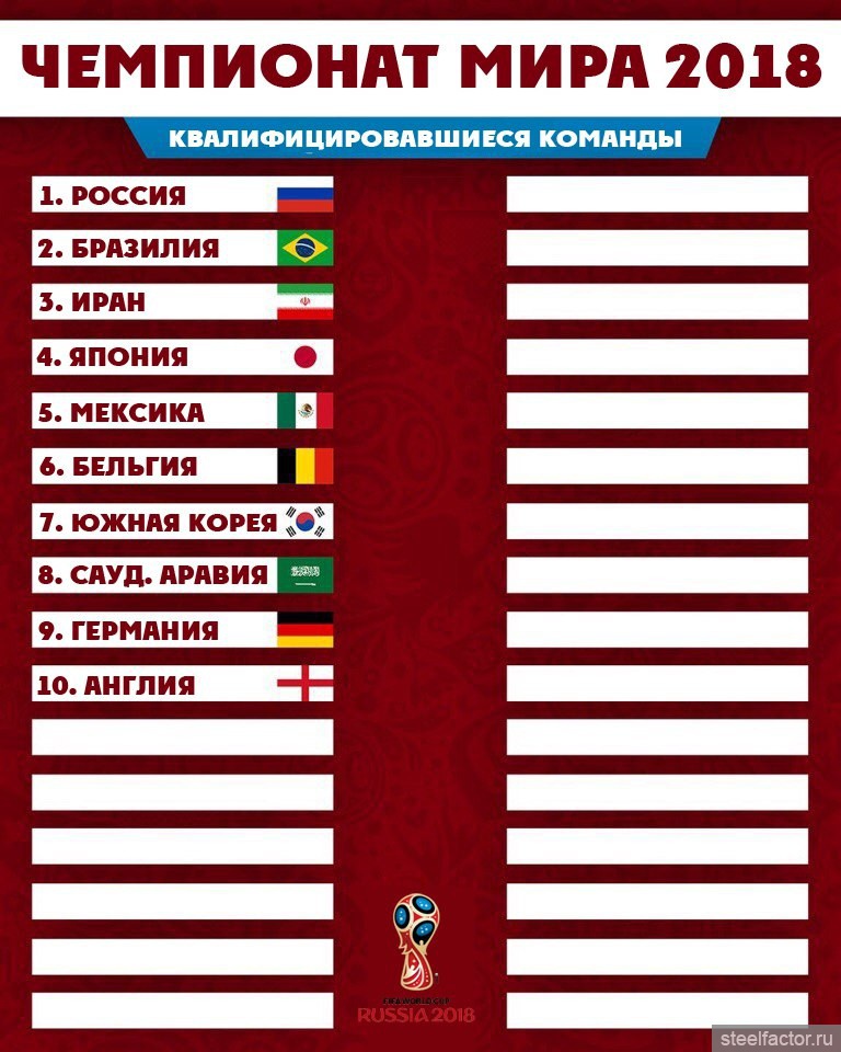 Помимо России, которая попала в первую корзину на правах хозяев мирового первенства, туда вошли Бразилия, Португалия, Аргентина, Бельгия, Польша, Франция и действующий чемпион мира Германия.