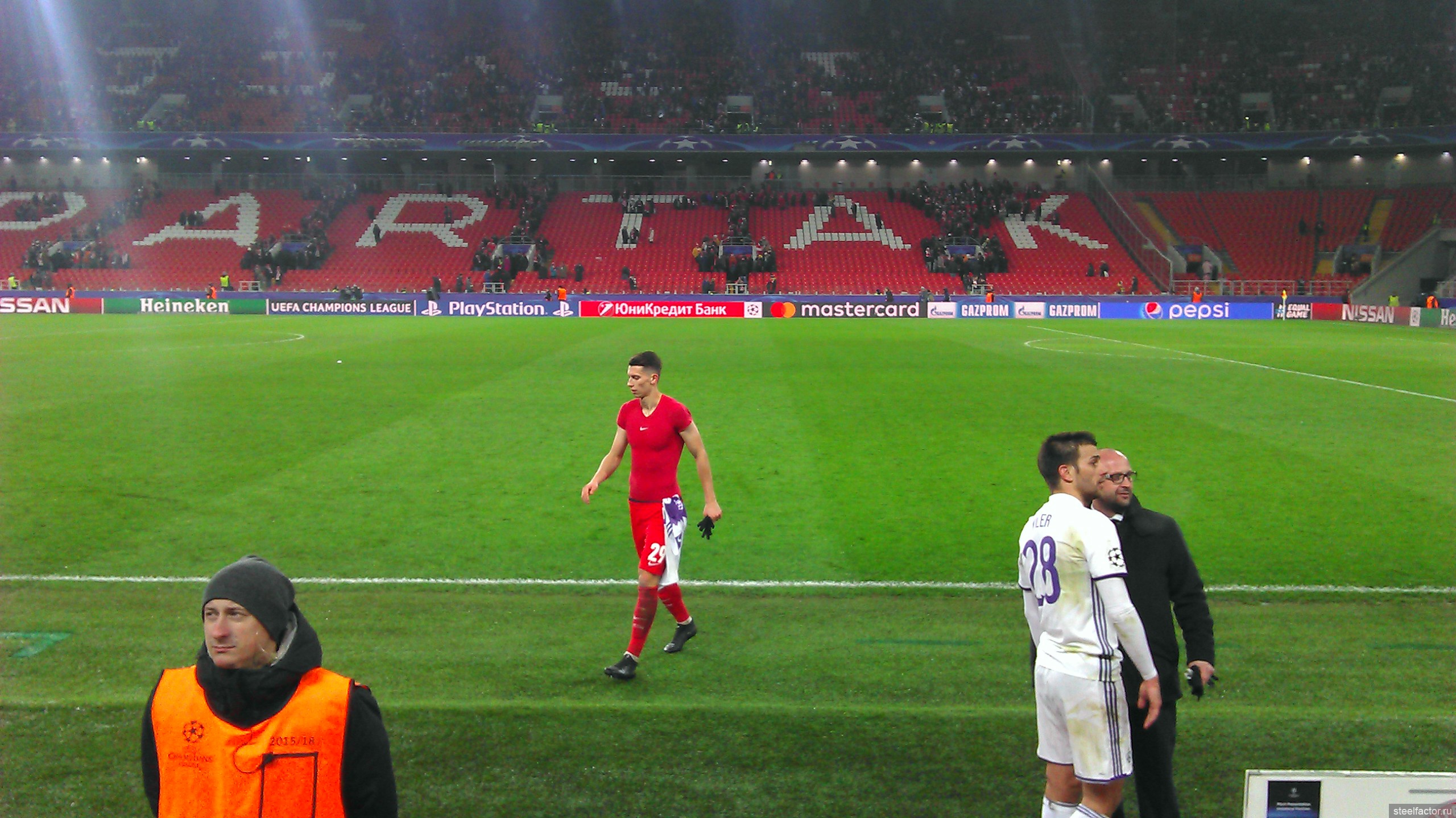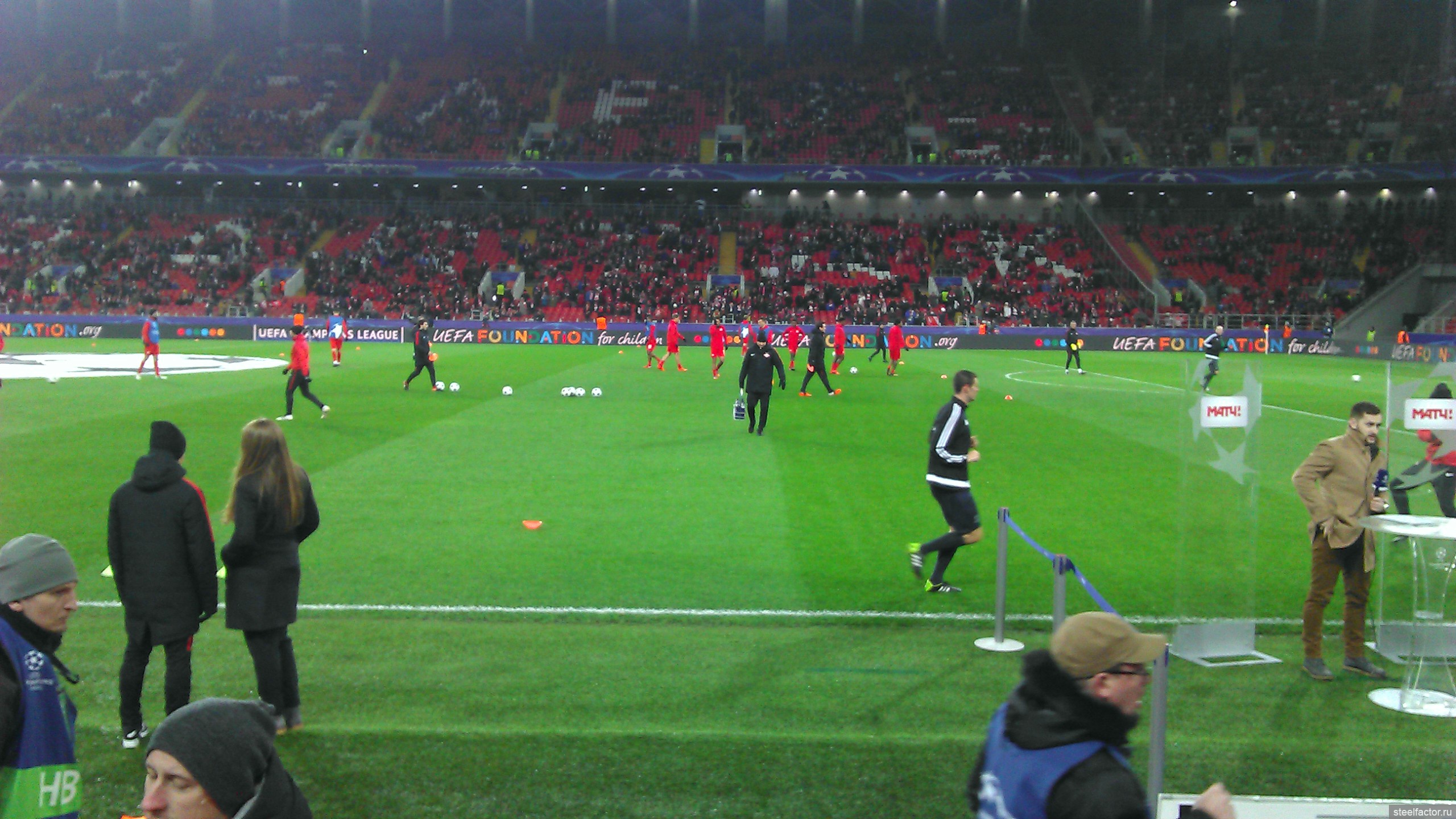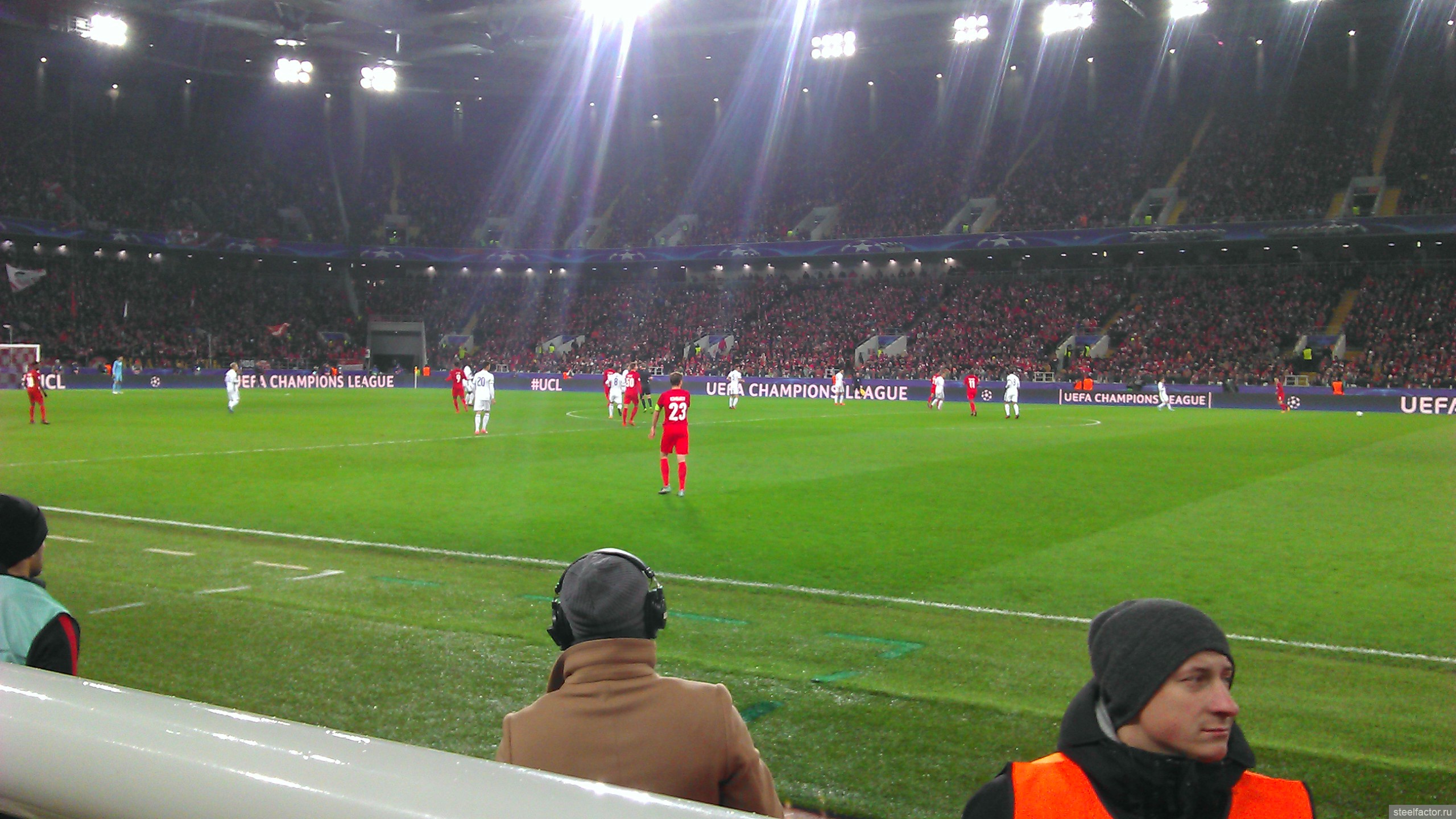 Я сёдня сидел ваще на козырном месте, на 1-м ряду прямо возле поля, и справа от скамейки запасных Спартака. Ощущения супер. Игроки бегают прямо перед тобой, в 10-ти метрах, и кажется, что сам играешь. Игра с такого близкого расстояния смотрится совсем по-другому. Оказывается играть в футбол чертовски трудно))))) ( это сарказм конечно).. Сидя у телевизора кажется, что ты сможешь легко всё исполнить, но находясь практически у кромки поля, так уже совсем не кажется. Скорости огромные, на раздумье нет, все игроки закрыты, принимать решение нужно в доли секунды. Но конечно что творится вдали, видно плохо, игроки закрывают друг друга. Но зато мне повезло, внизу прямо под нами был небольшой телик с прямой трансляцией, я туда иногда смотрел, ну и на табло.