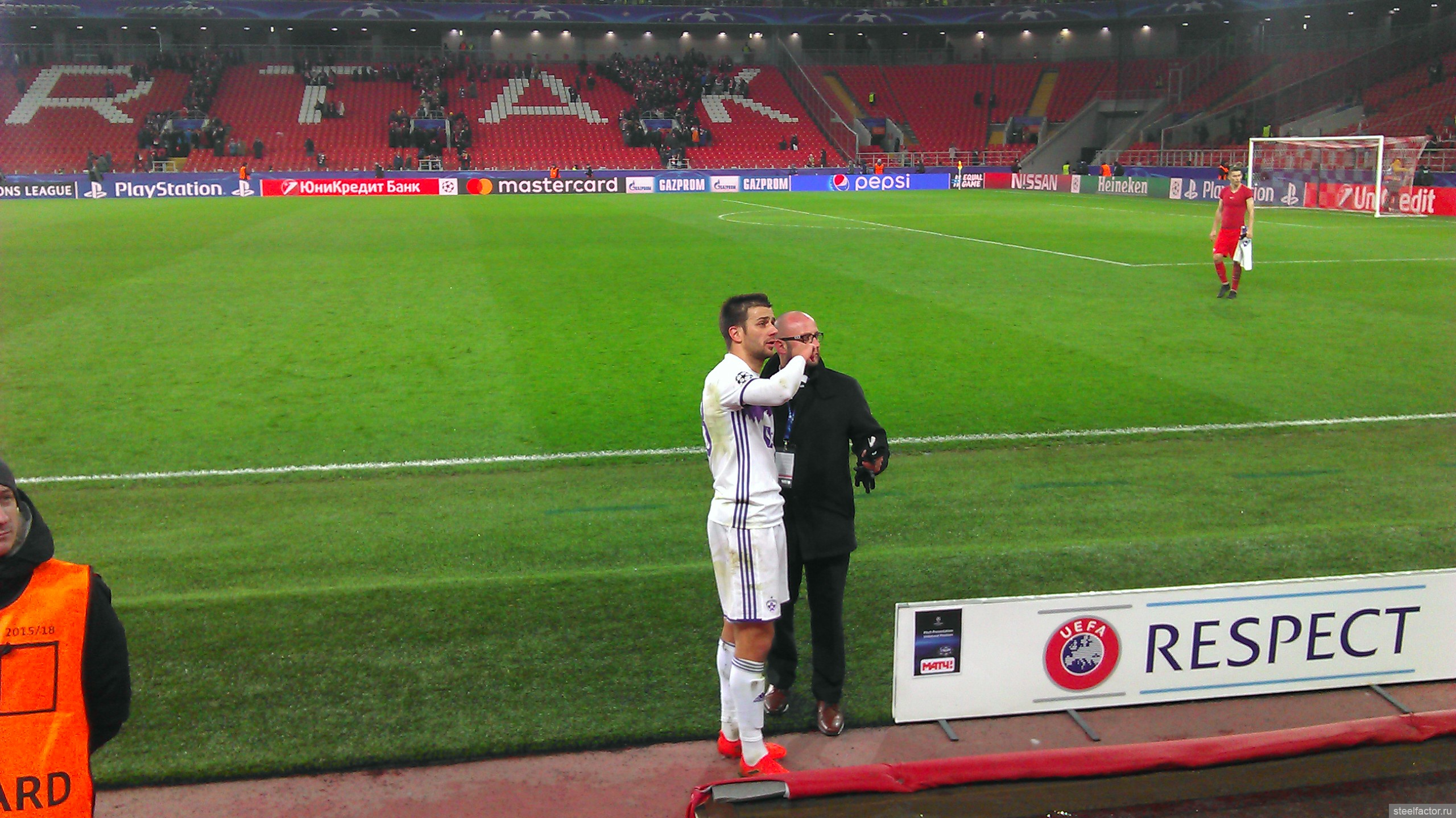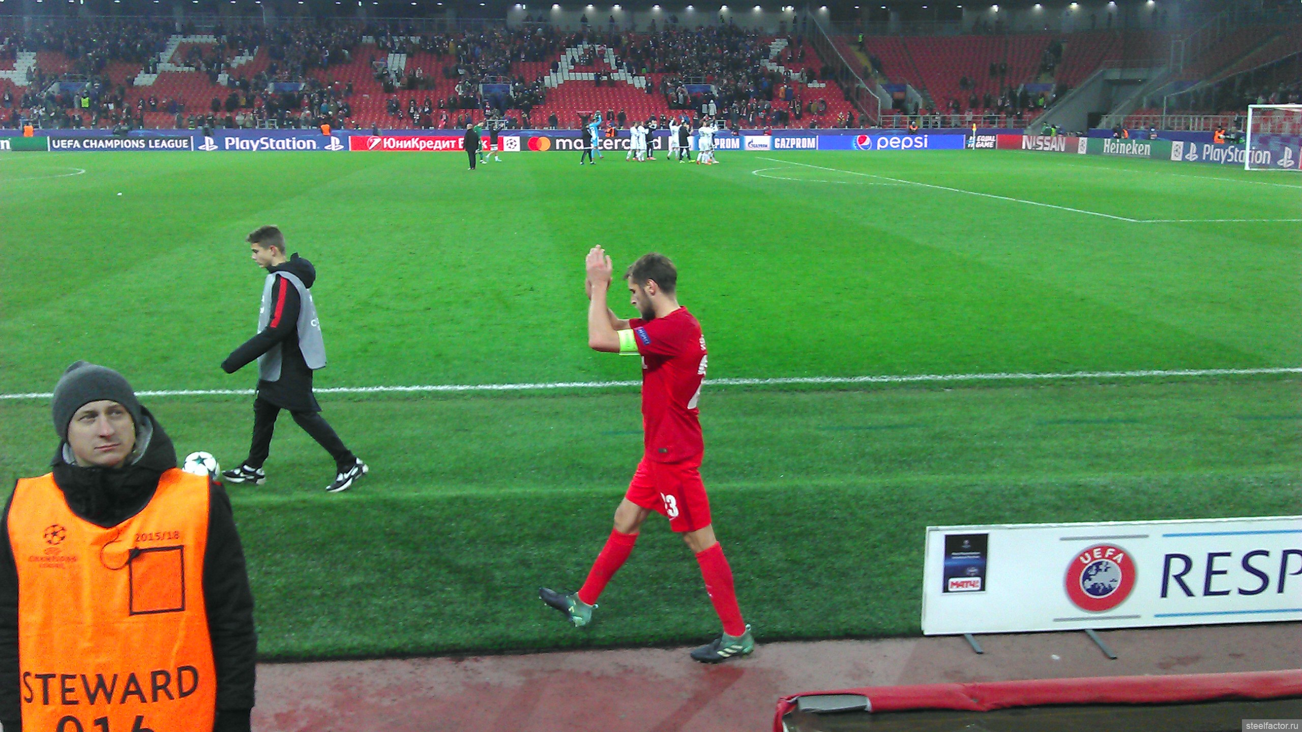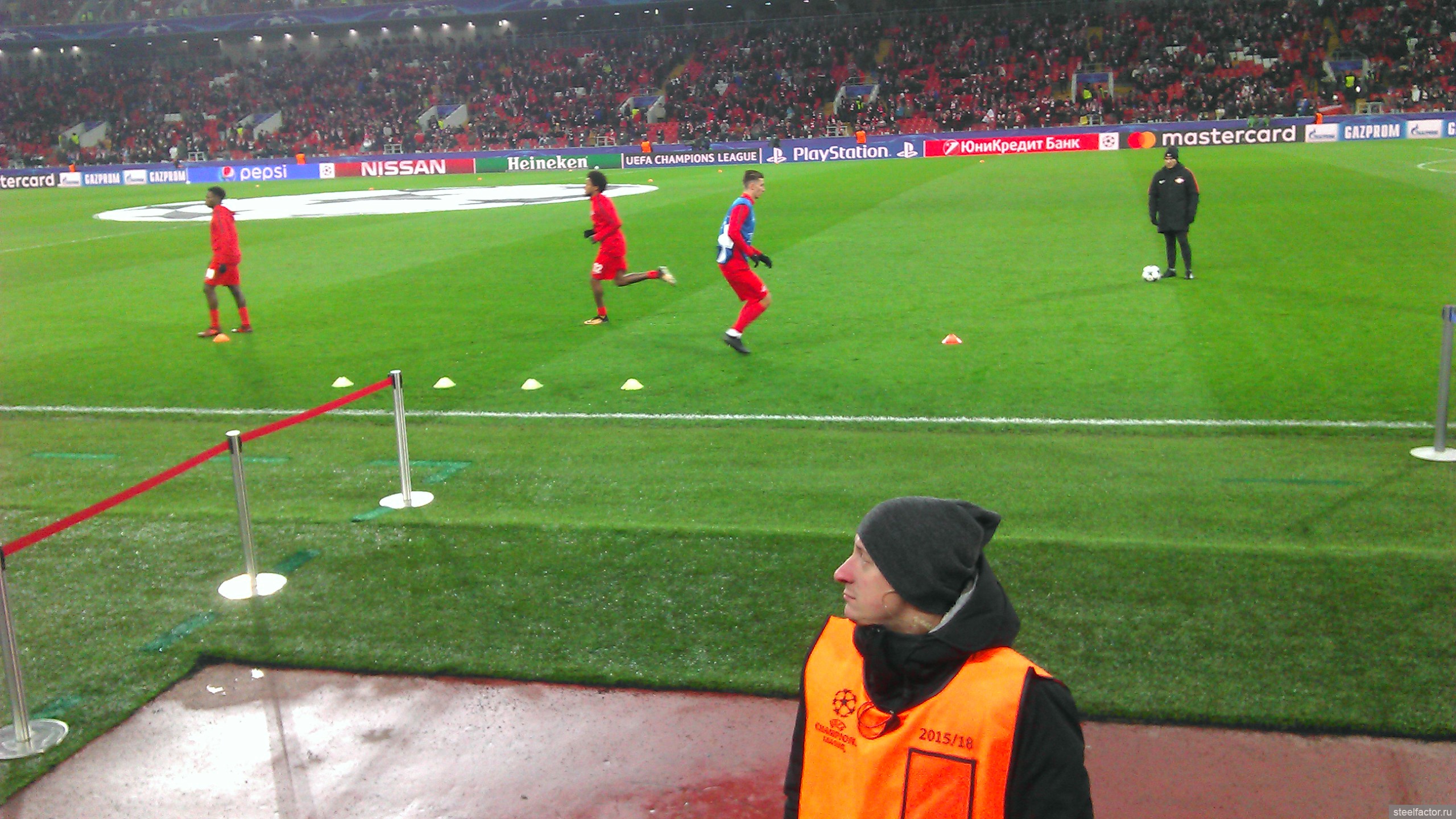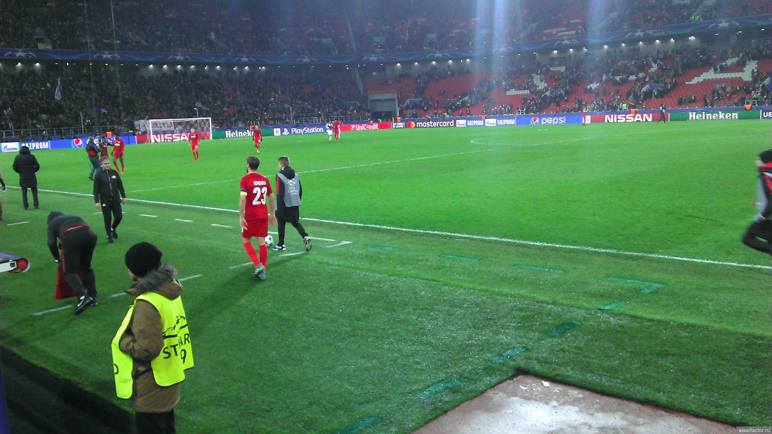 Я сёдня сидел ваще на козырном месте, на 1-м ряду прямо возле поля, и справа от скамейки запасных Спартака. Ощущения супер. Игроки бегают прямо перед тобой, в 10-ти метрах, и кажется, что сам играешь. Игра с такого близкого расстояния смотрится совсем по-другому. Оказывается играть в футбол чертовски трудно))))) ( это сарказм конечно).. Сидя у телевизора кажется, что ты сможешь легко всё исполнить, но находясь практически у кромки поля, так уже совсем не кажется. Скорости огромные, на раздумье нет, все игроки закрыты, принимать решение нужно в доли секунды. Но конечно что творится вдали, видно плохо, игроки закрывают друг друга. Но зато мне повезло, внизу прямо под нами был небольшой телик с прямой трансляцией, я туда иногда смотрел, ну и на табло.