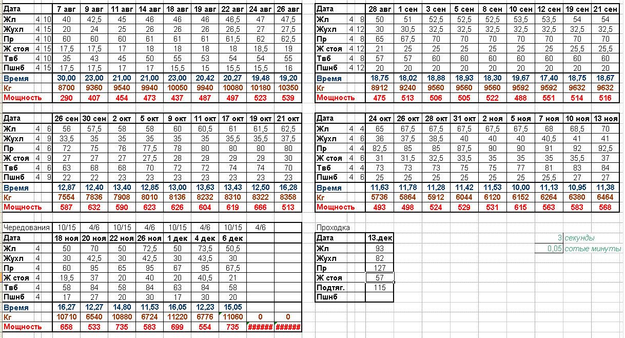 Опять добавил по 2,5 во всех упрах. Паузы держал 10-15 не взирая на высокий пульс.В итоге увеличение тоннажа на 260 кг и сокращение времени на 20 сек.