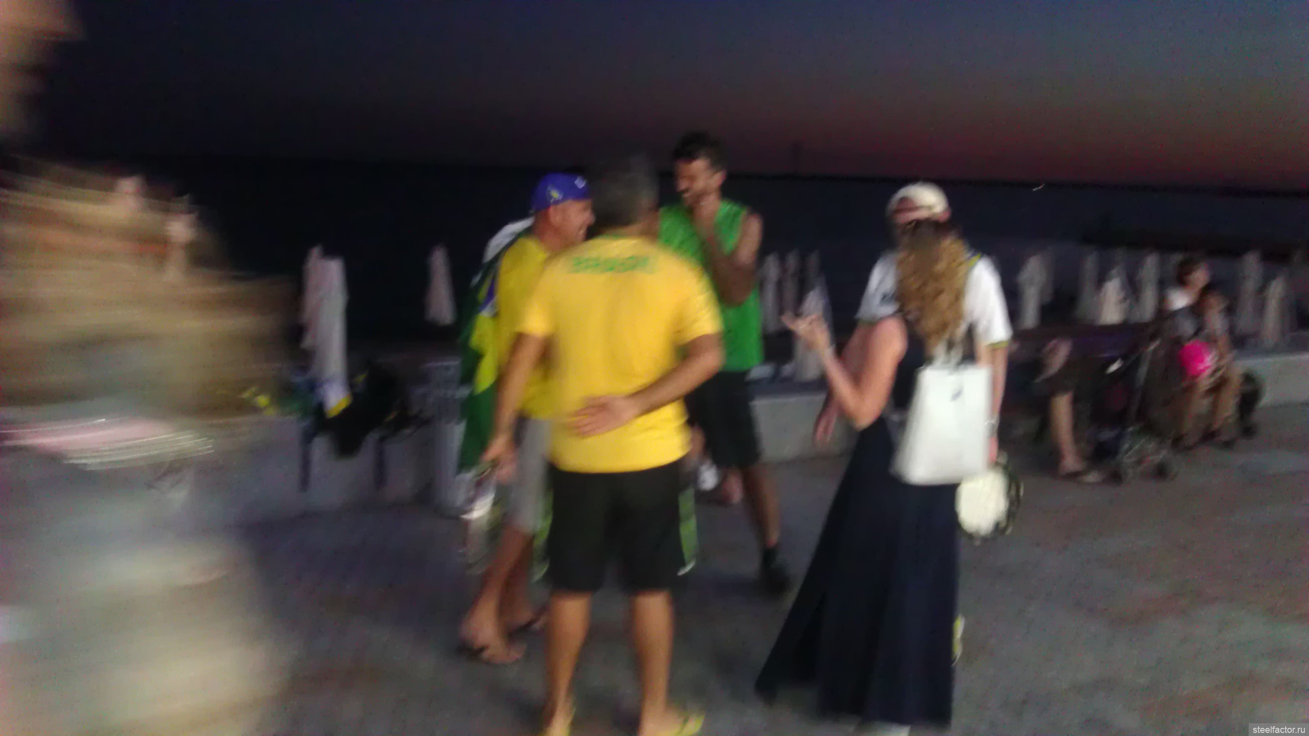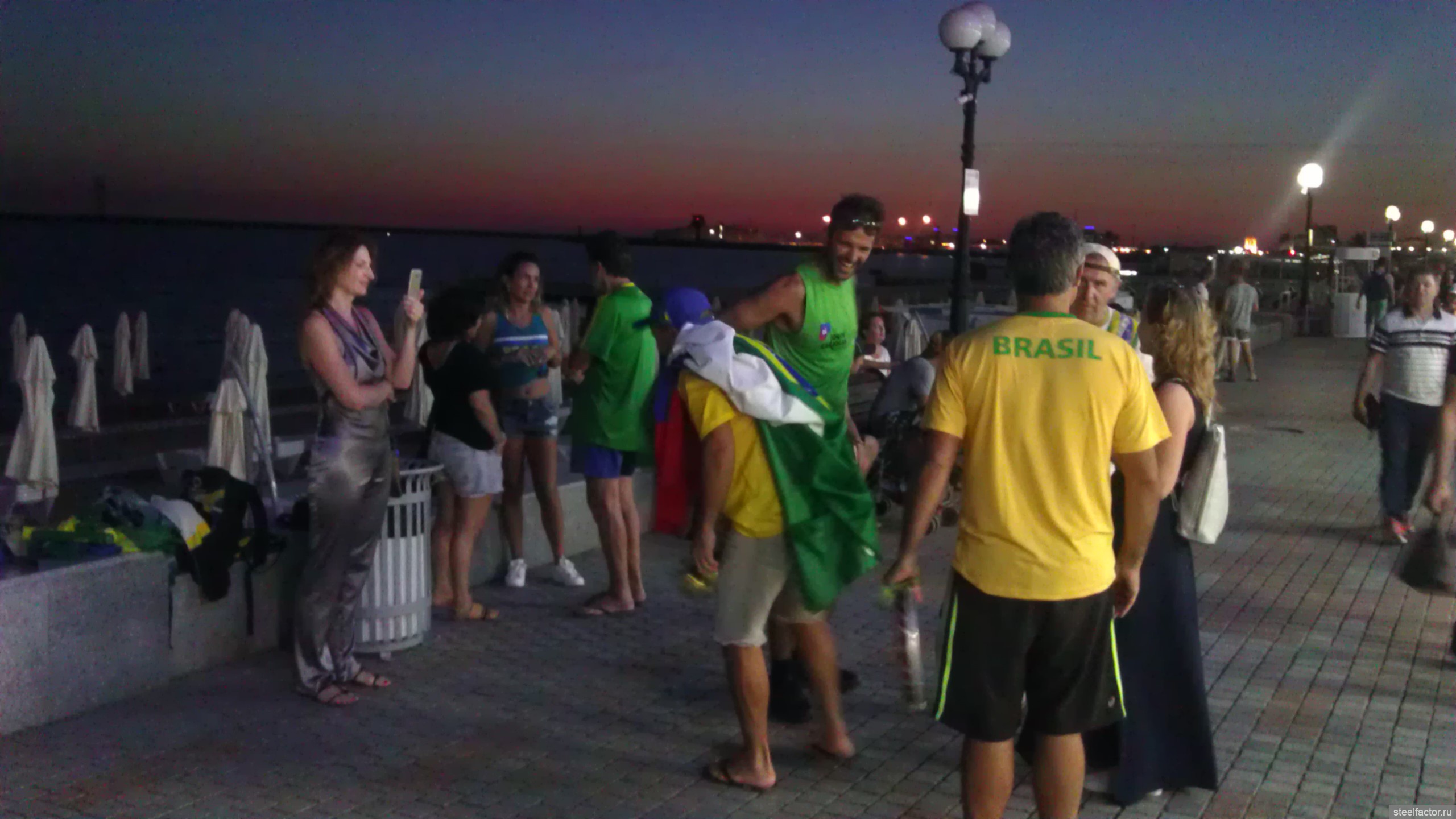 Вау, супер!!!!! Щас гулял по набережной, туристы приехали, пока не много, но уже хватает. Я впервые такое вижу за все годы. что живу здесь. Бразильцы ( у них тут тренировочная база), португалов много. Испанцев всего пару раз видел. Почему-то мексиканцы были, я так и не понял, что они здесь забыли. Ну и много народа в клубных футболках, которые я разумеется не смог идентифицировать ( ещё бы, это вам не барсы-баварии-мю). Просто иностранцы, ясно по речи, без опознавательных признаков. Но все латиносы, хрен знает, я в них не разбираюсь. И пару фоток, это бразилы разумеется, они сначала танцевали, я не успел сфоткать, потом один встал на колено с Кубком Мира, и снова я прощёлкал))) ( и ваще не очень вышло, ну да ладно)