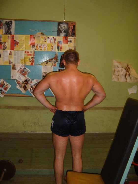 А теперь спина его. Кстати у Сергея очень хорошие и мощные дельты, трапеции. Ну, а руки и голень ещё нарастятся.