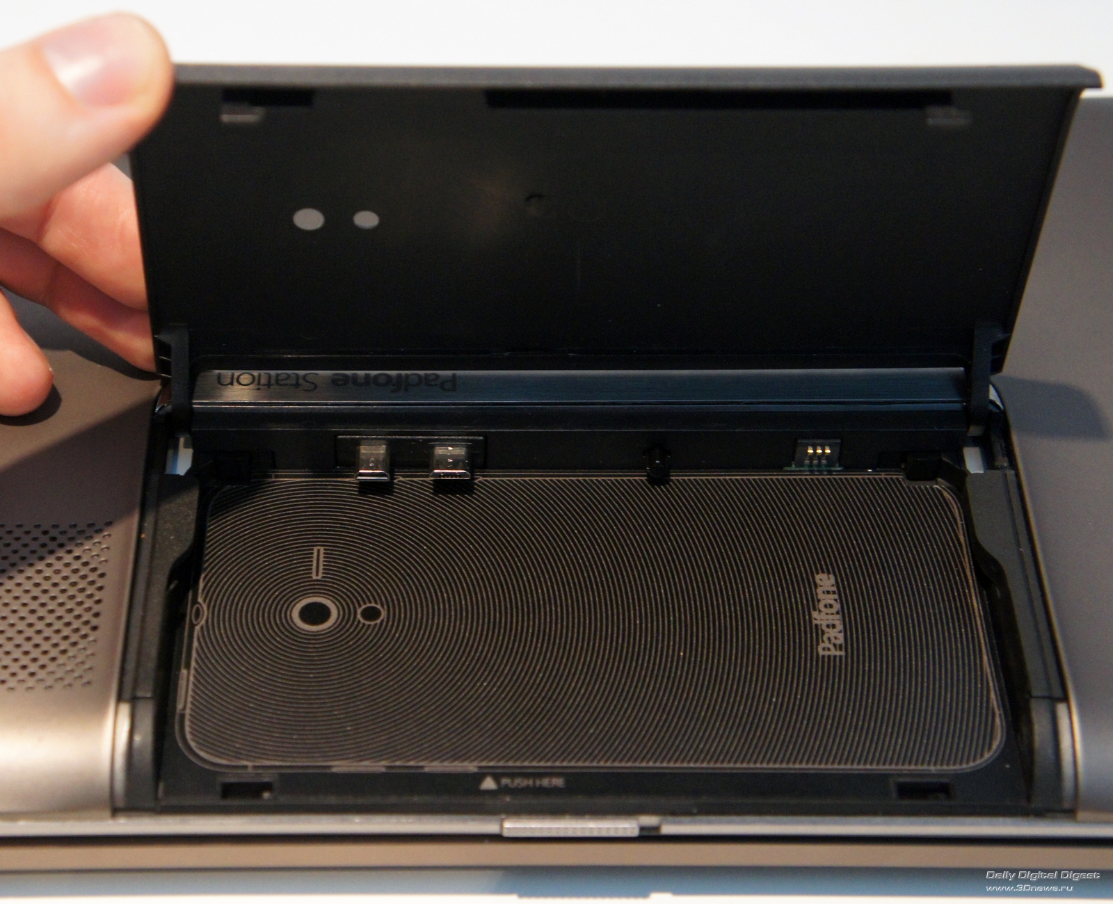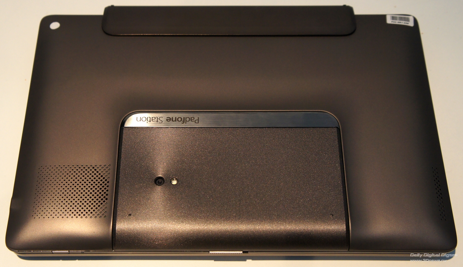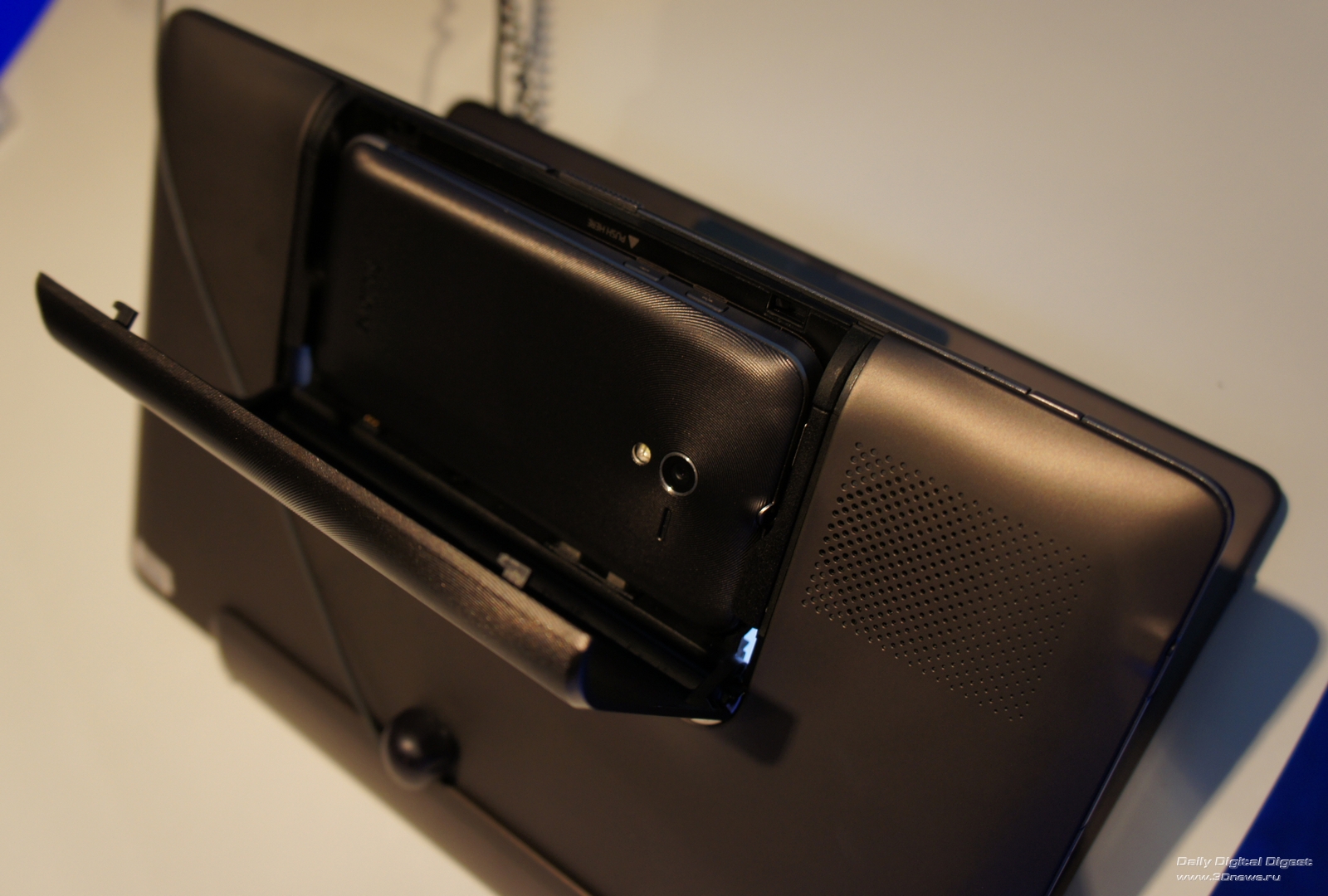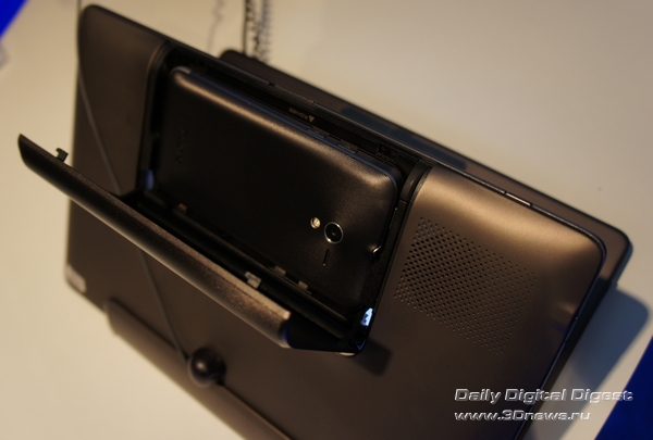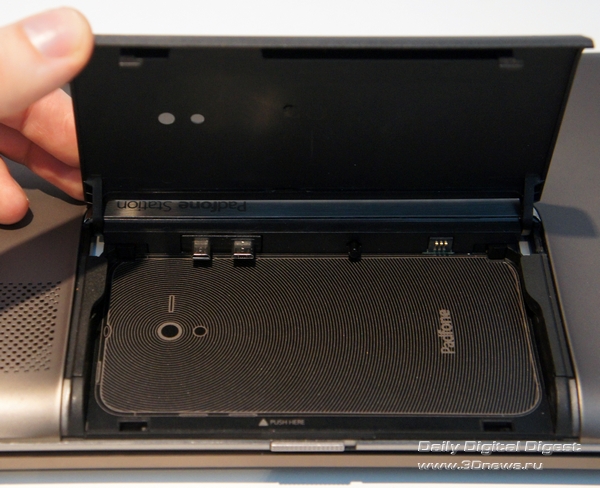 PadFone – как матрешка. Маленькое вставляется в большое. Так, телефон можно установить в док-планшет под названием PadFone Station, представляющий собой упакованные в весьма толстый пластиковый корпус IPS-матрицу с разрешением 1280х800, объемную батарею на 6600 мА*ч и крошечную камеру на передней панели. Больше всего PadFone Station напоминает первый Transfomer. Только еще толще. Ну а ежели не считать миллиметры, то можно просто перепутать, по дизайну семпл док-планшета для ASUS PadFone чрезвычайно напоминает родоначальника линейки.Для установки смартфона в планшет требуется открыть дверцу в верхней части последнего и аккуратно вставить телефон так, чтобы разъемы MicroUSB и MicroHDMI на его боковой грани оказались совмещенными с соответствующими штекерами в планшете. На том же боку телефона есть три дополнительных контакта – именно их замыкание на соответствующие контакты в планшете и запускает перевод устройства в «планшетный» режим. Три секунды – и смартфон превращается в элегантные шорты планшет.