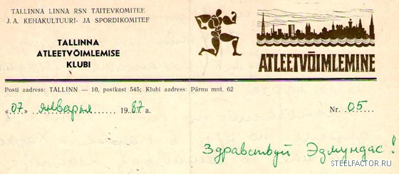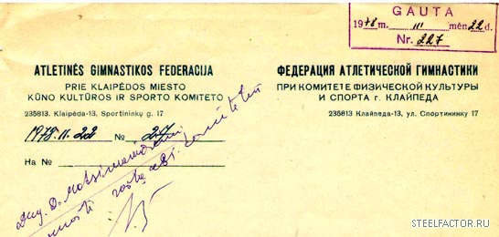 Naskol'ko mne izvestno, odnoi iz samykh pervykh (ili dazhe samaya pervaya) oficial'nykh organizacii nashego sporta yavlyaetsya Federaciya atleticheskoi gimnastiki Litovskoi SSR - ee uchrezhditel'noe sobranie sostoyalos' 14 fevralya 1969 g., a prikaz Sportkomiteta Litovskoi SSR Nr. 373 vyshel 1969 03 05.